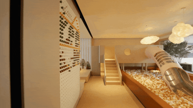 项目通过"景观最大化"设计理念,确保这两栋楼南向直面约400㎡月庭涧镜面水院,东侧衔接约200米滨河漫步道,西向俯瞰悬浮树阵艺术景观,以三面环景的稀缺格局,让业主推窗即享园区最佳景观视野。