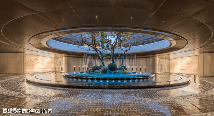 没错,元序出场就是板块首个!板块内首个豪奢大门,由设计大师孟凡浩创作的光环门廊,超百米宽、近11米挑高,中央动态艺术装置“揽星舟”,两侧约8米加纳利海枣与约5米塔形罗汉松,一眼望去豪奢大气,业主倍有面子。