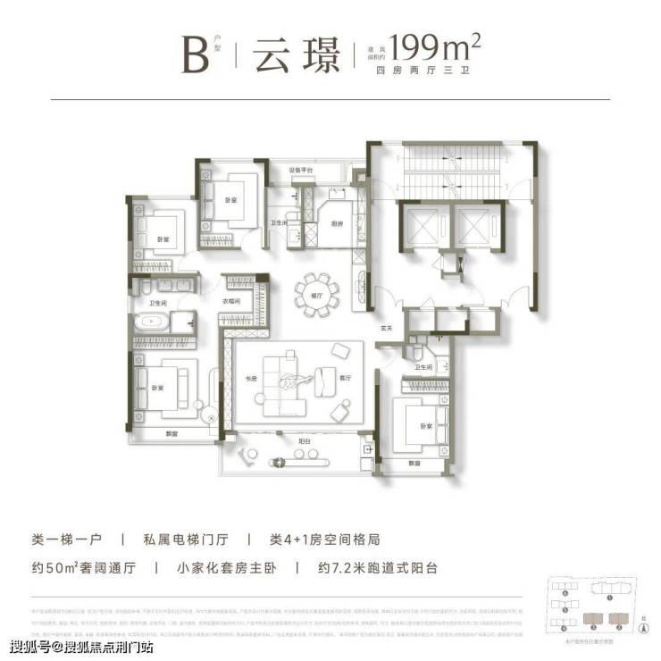 高层建面约199方,有A、B两款,四房两厅三卫双套房格局,南北通透、类独门独户、南向奢阔瞰景阳台,每一个都相当有“杀伤力”。