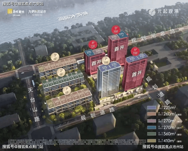 华润元起观潮府位于杭州市上城区安琪儿板块,天台山路与闸皋路交叉口东南侧,由央企华润置地开发,项目规划包括4幢12-19层高层住宅和3幢6层叠墅,产品面积段覆盖高层约225-270平方米、叠墅约260-410平方米,总户数186户(高层130户、叠墅56户),容积率2.3,楼面价50683元/平方米。
