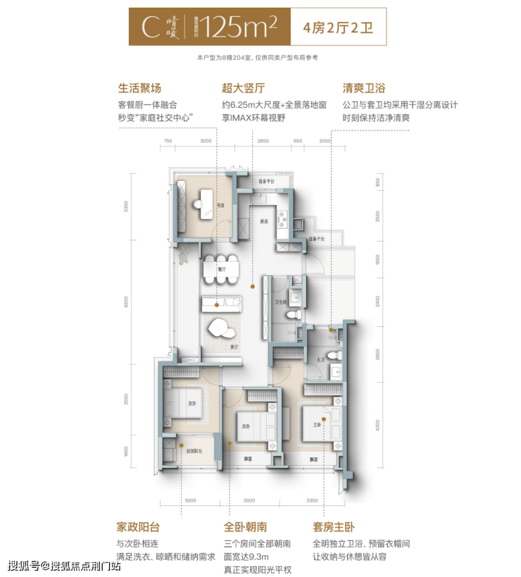 约169㎡的4房2厅3卫,四开间朝南,约17.3米的MAX级巨幕面宽,让房间内的每一个主人,都能享受到阳光平权。