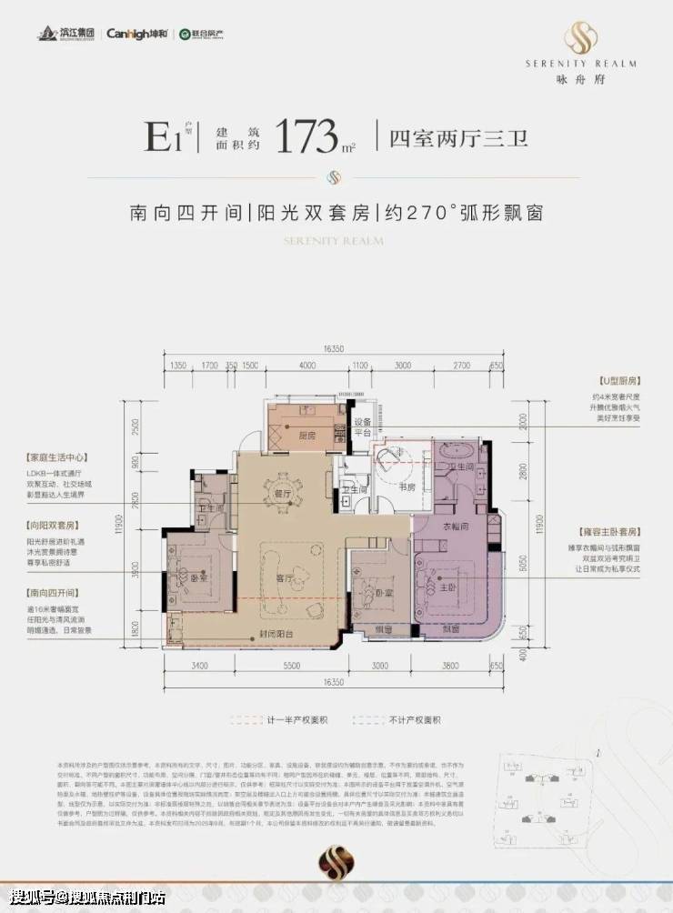 建面约173㎡E1边套户型,4房2厅3卫,类一梯一户,四房朝南,南北通透,主卧为大面积弧形转角窗设计,含赠送得房率约89%左右。