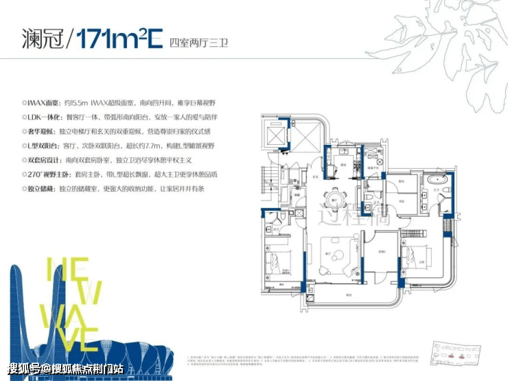 约171㎡大四房:三卫双套房,南向面宽约15.5米,主卧带L型转角飘窗,总价约700万实现终极改善。