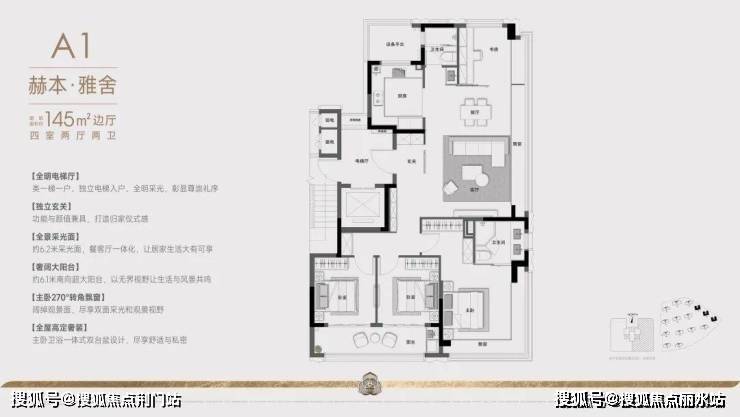 建面约145㎡的户型:项目采用创新的"两梯两户"设计,通过巧妙的空间规划实现类一梯一户的尊享体验。双电梯厅以防火门分隔,确保住户私密性。专属电梯直达户门,10平方米的270度转角入户花园,兼具采光通风优势,将功能性与仪式感完美结合。