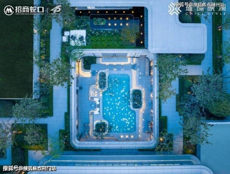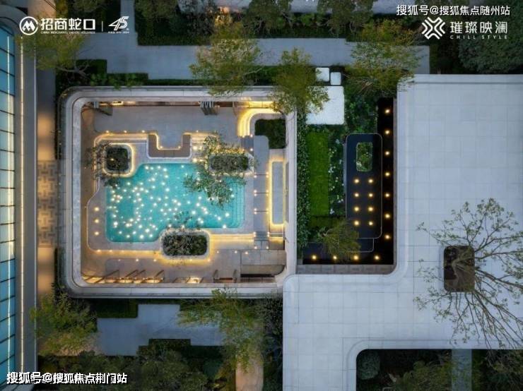 下沉式庭院,卡拉卡白石材马赛克包裹的戏水池,在夜色下状如星河闪耀,三棵源于地中海的“万木之王”银叶油橄榄树点缀其中,更有层级式的叠水,休闲卡座,让身临其境地体验海岛度假般的松弛和自在。