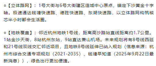 ◎【城市公园】:金沙湖公园、沿江湿地公园,热带风情休闲景观打造杭州“小三亚”、环湖慢跑道、金沙大剧院、金沙湖沙滩、文化艺术广场等已全部开放。