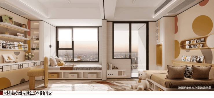 作为“主力王牌”产品,建面约108㎡户型采用去过道化设计,空间灵活可变,可打造开放式厨房拓展家庭场域,适合年轻夫妇;也可将北向书房与次卧融合,变身双孩套房,灵活适应家庭成长需求。