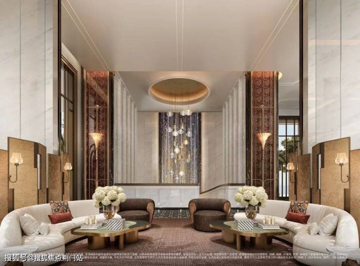 会所挑空壮观,吊顶、水晶灯,以及搭配香槟金的色系,豪宅感很强。