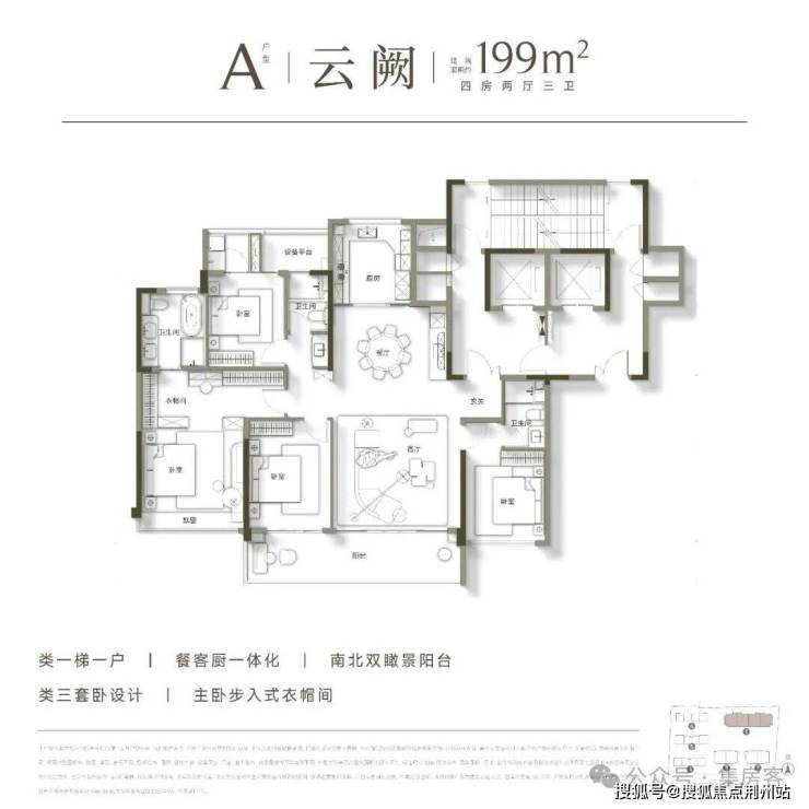 高层均为建面约199㎡的大平层户型,极致纯粹的业主圈层,带来更为尊贵的居住体验。其户型设计尽可能扩宽南向开间的同时,展现出了极为阔绰的空间尺度,足以满足多代同堂的居住需求,成为众多购房家庭终极改善的首选。