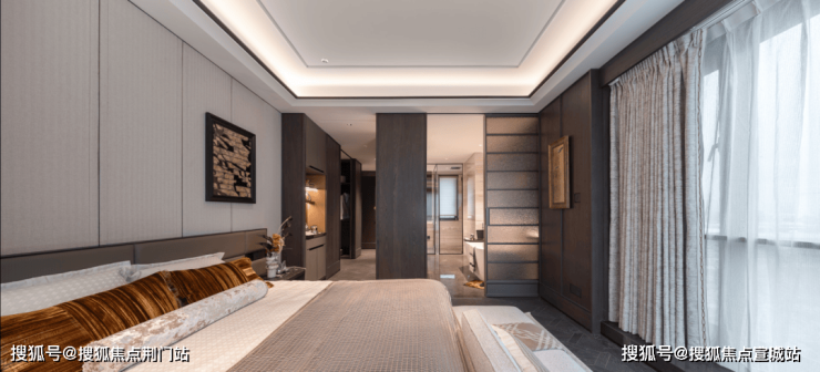其中,主卧不仅自带270°转角窗,还设计了“洄游式”动线:开放式的梳妆区串联休息区和衣帽间,完成场景的无缝转换。