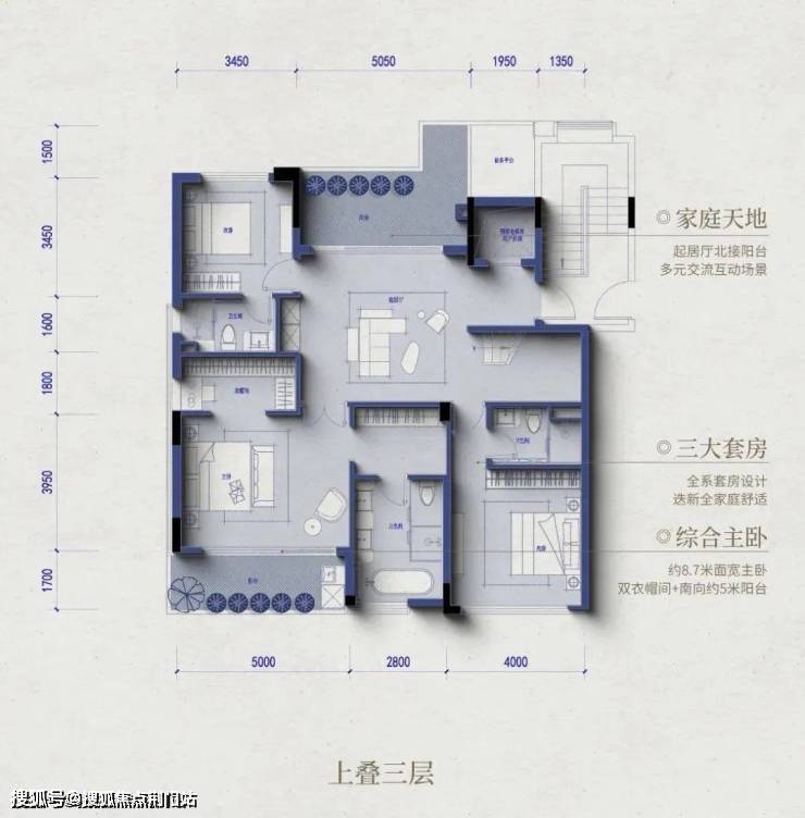 ③南向大面宽:在绿城的低密产品研发中,「南向大面宽」拥有非常关键的研发优先级。建筑面积约295平米的上叠户型与建筑面积约275平米的下叠户型,都拥有奢侈的约11.8米南向大面宽,每一个客餐厅、卧室套房都拥有更敞亮的采光与视野;客餐厨LDK一体化的设计,更是让叠墅的室内空间拥有与大平层一样的通透感。他们还在卧室套房之间设计了一个与阳台交融在一起的起居室,这里可以是你们家的公共书房,也可以成为卧室旁的兴趣空间。