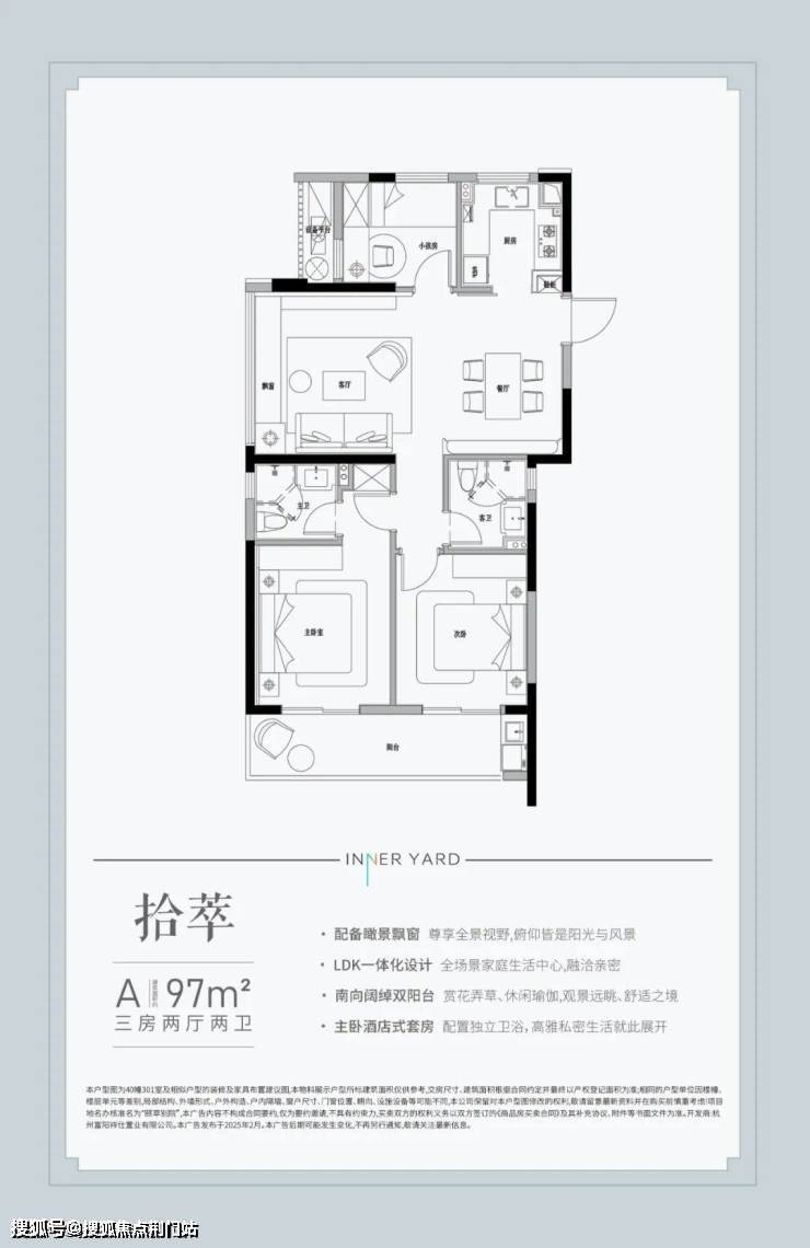 建面约97㎡三室两厅两卫户型都是边套,三面采光,还有很难得的6.4米南向双阳台,3.9米的景观大飘窗,类似的尺度市面上基本要120㎡的户型才能做到。