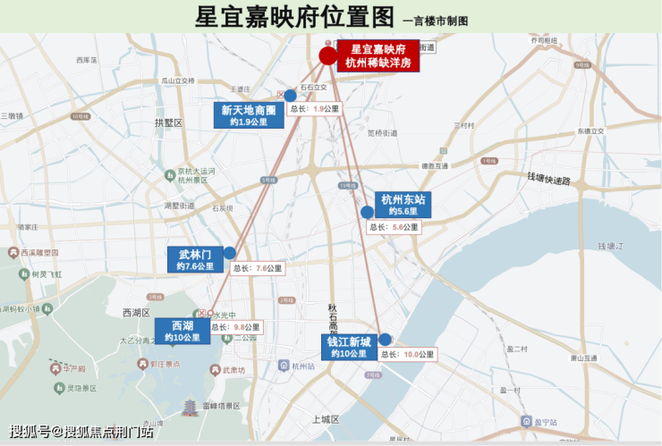 星宜嘉映府位于拱墅区新天地商圈华丰路上,直线距离武林广场仅约 8 公 里 ,钱江新城万象城约10公里,距离西湖景区仅10公里,是个去哪儿都很方便的优质板块。