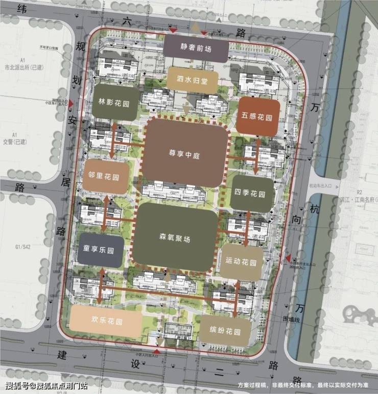 切换到小区主入口,以院落、水景、长廊形成了系统化场景串联,以泗水归堂为节点,把喧嚣城市代入静谧园区,形成酒店般的归家感受。