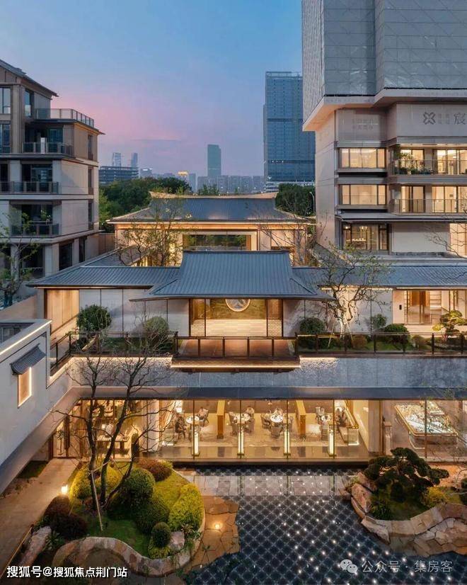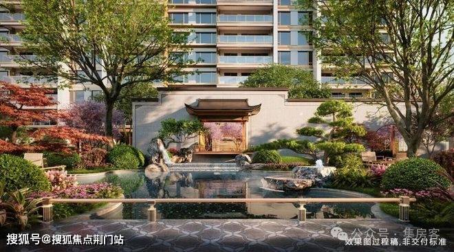 采用“王府中式”设计,大门为歇山顶形制(宽53米、高近11米),配黄铜狮、罗汉松及蓝翡翠奢石。园林融入西湖十景元素,如“花港观鱼”水景、“柳浪闻莺”绿植,并设雾森系统首层单元门厅石材铺就,肌理沉稳。