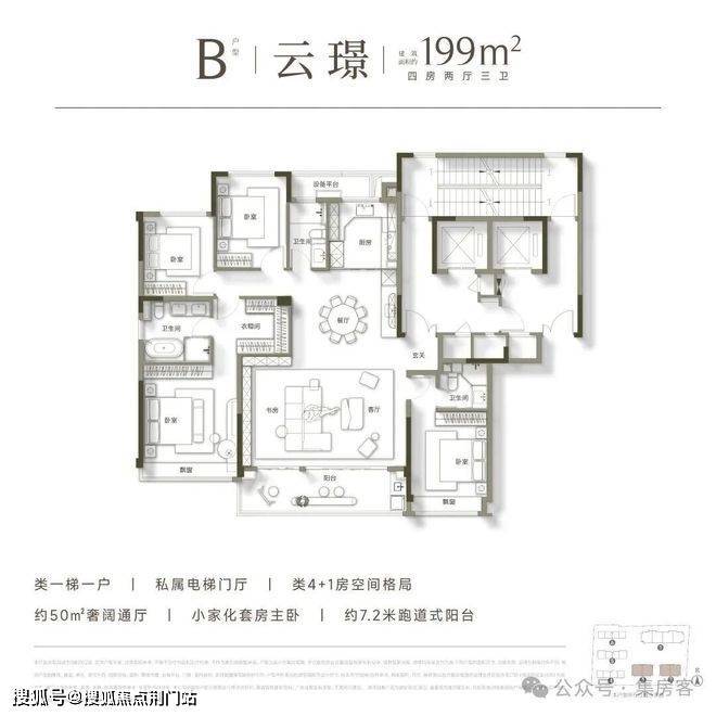 高层均为建面约199㎡的大平层户型,极致纯粹的业主圈层,带来更为尊贵的居住体验。其户型设计尽可能扩宽南向开间的同时,展现出了极为阔绰的空间尺度,足以满足多代同堂的居住需求,成为众多购房家庭终极改善的首选。