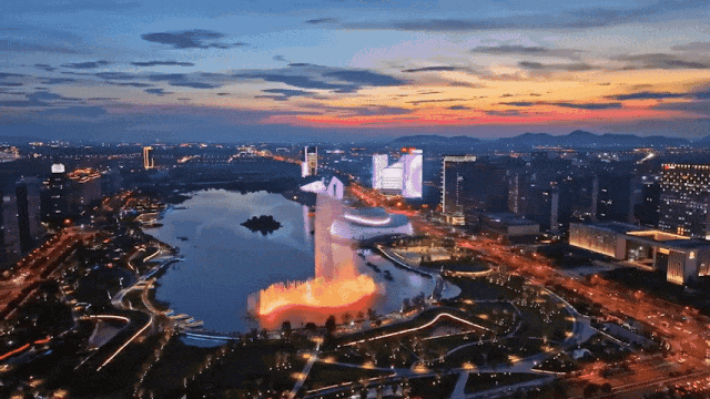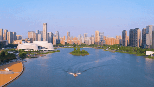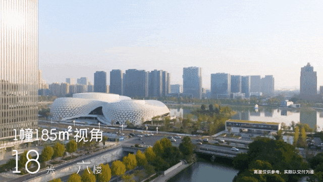 就像奥邸国际的窗外,依次有水景(钱塘江)、城市地标(大墨镜+莲花碗)、摩登天际线(一江两岸建筑群),三者辉映成一部澎湃的景观交响曲。朗拾湖著恰好也集齐了这三重胜景。