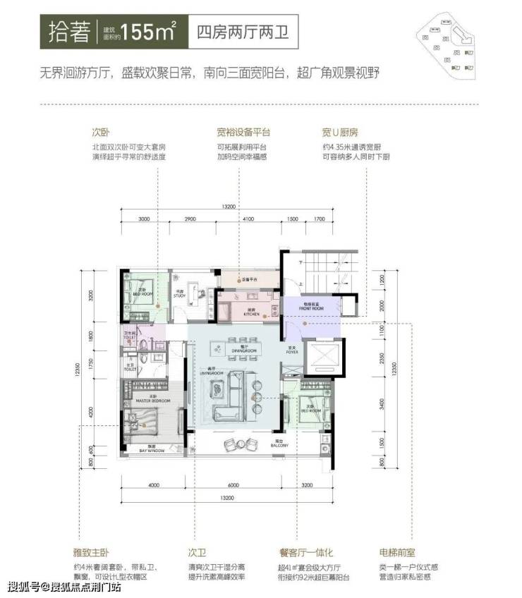 约155㎡大四房,拥有 超41㎡的社交大方厅+约9.2米的跑道式阳台。部分房源正对金沙湖,落地窗流转着它的晨昏四季。