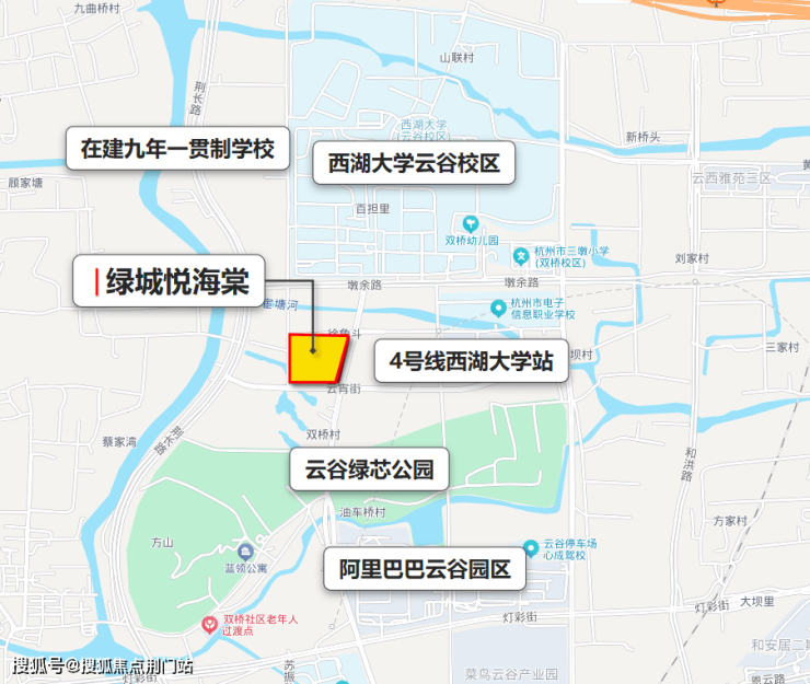 绿城悦海棠位于西湖区云谷板块,北侧200米即为西湖大学云谷校区,一路之隔为限价时代摇号热盘绿城熙海棠,位置上属于云谷板块的中心区域。