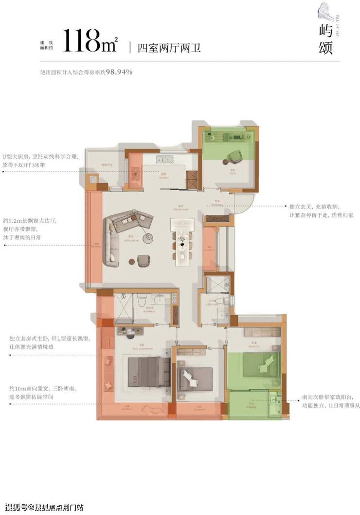 118㎡户型则拓展了7个飘窗与2个阳台,其室内使用面积可与市面上部分139㎡户型持平。