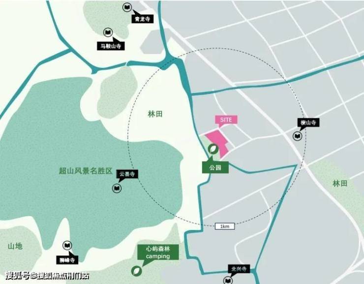 整体布局以中央山水景观轴为骨架,将松石叠泉和山水林间两大景观要素贯穿全区。营造“一轴一带八景十巷”的多进式园林体验。第一策略是充分利用自然景观的优势,运用中国传统园林设计中的“借景”手法,将超山和基地西侧的城市公园风景引入居住区。