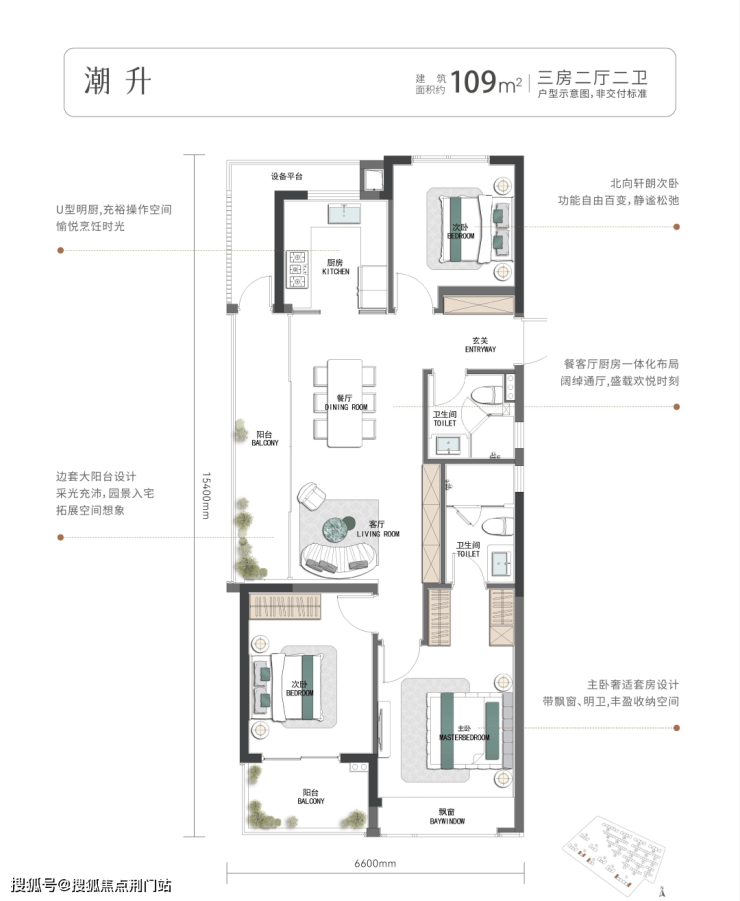 建面约109㎡的三房两厅两卫户型,最大的亮点在于其开阔的社交空间与优越的采光视野,以及在功能布局与居住品质上的动态平衡。