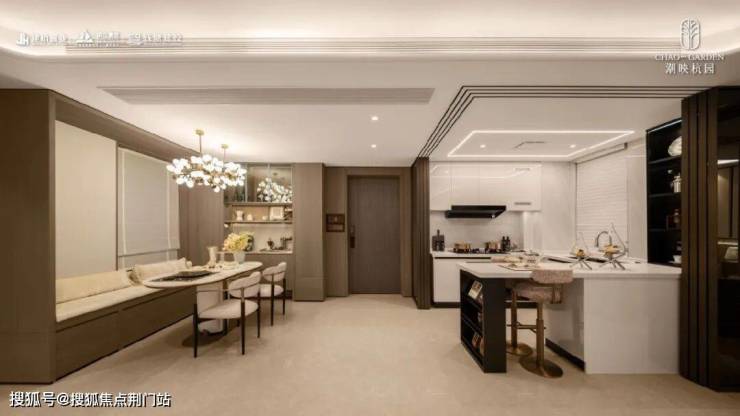 餐客厅、厨房的一体化设计,形成了阔绰的家庭公共活动区域,空间利用率高;配合边套位置带来的大阳台,不仅让室内采光充沛,更将园景引入室内,极大地延伸了视觉空间与生活场景。