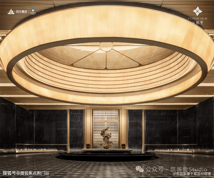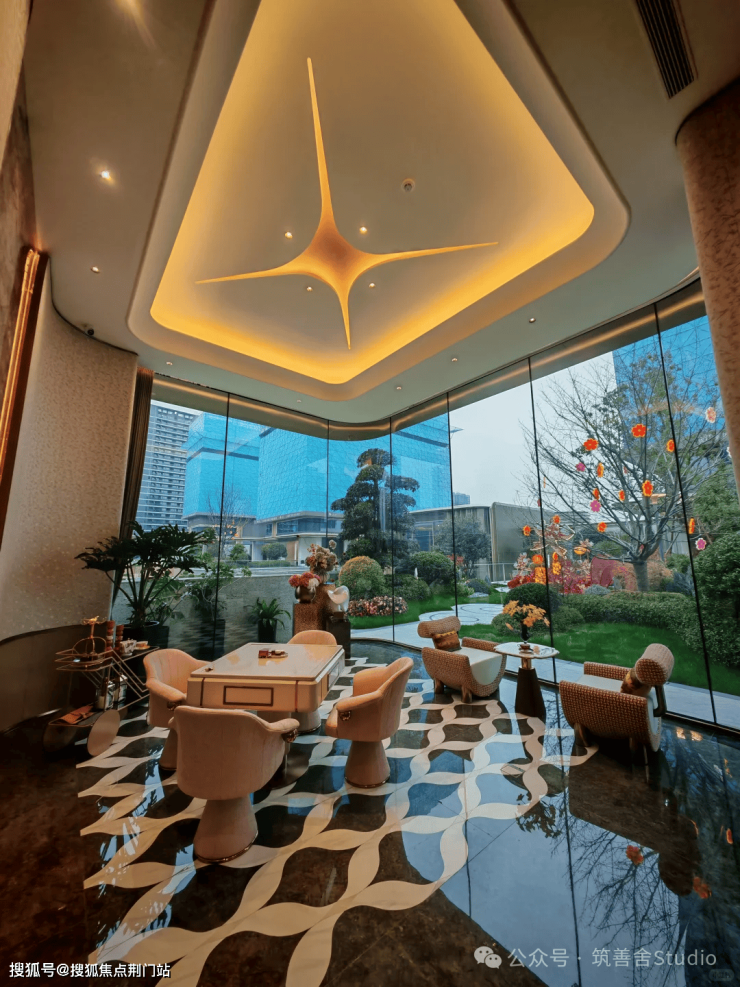 小区大门以“云扉初开”为灵感,打造具有仪式感的礼仪入口。宽约66米、高约8.6米的恢弘门庭,与酒店式归家大堂共同构筑,打造出极具仪式感的序厅,瞬间开启归家的尊崇心境。入口处精心打造的树阵水院,以静谧尊贵的氛围迎接归家。巧妙运用高差设计,通过层层递进的景观节点,优雅地引导业主步入社区深处。