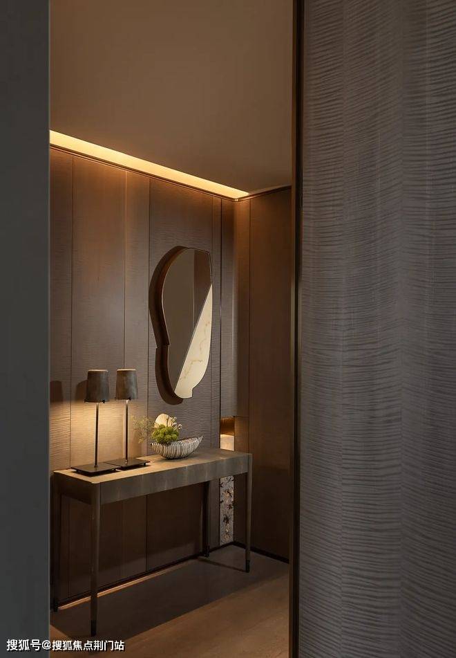 内外双重门厅景墙运用了约1000方顶奢才会用上的月光米黄石材,还是更费料的弧形石材,搭配香槟金线条,与爱马仕全球旗舰店的双曲面叠墙造景手法如出一辙。