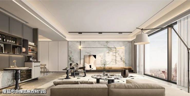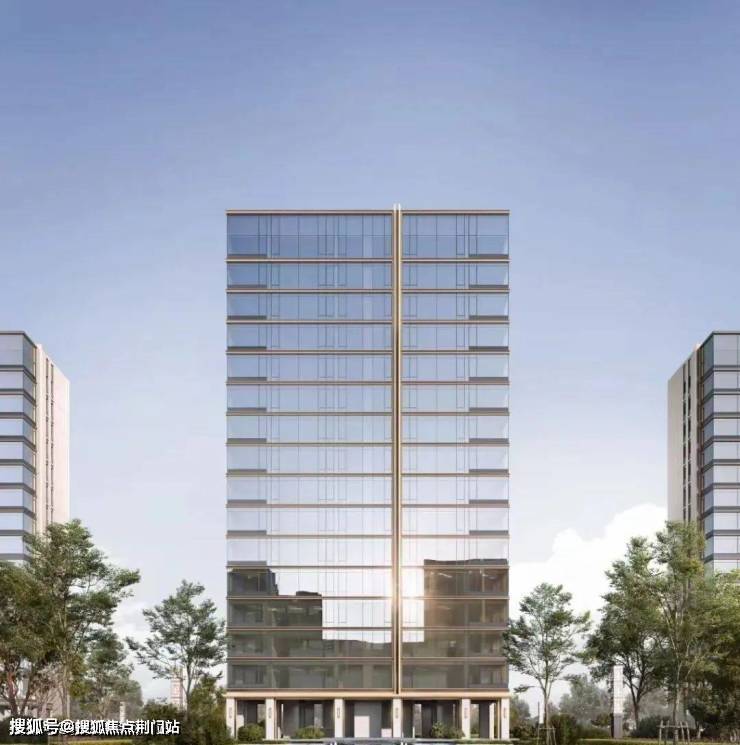 公建化的外立面,竖向采用大屏干挂香槟金铝板,横向则是香槟金与金色铝板纤细线条组合,配合南向大面蓝灰色落地玻璃,时代感超强。