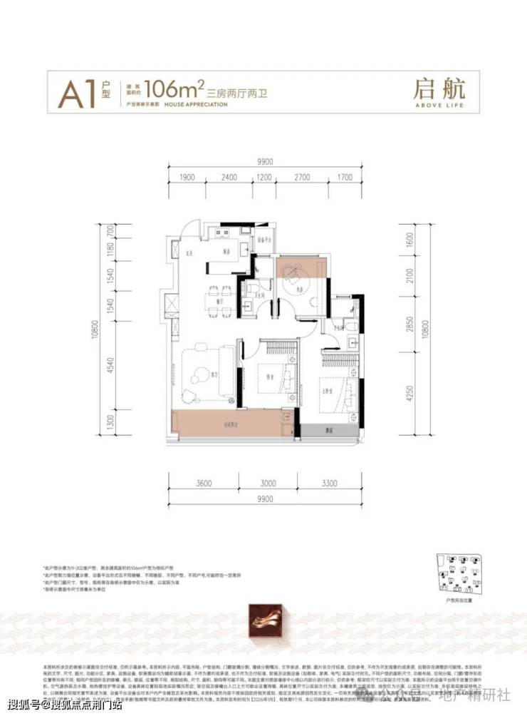 起步的建面约106方,南向开间达到约10米、封闭式阳台、客厅做了S墙,非常适合年轻夫妻或三口之家,空间尺度很舒服。