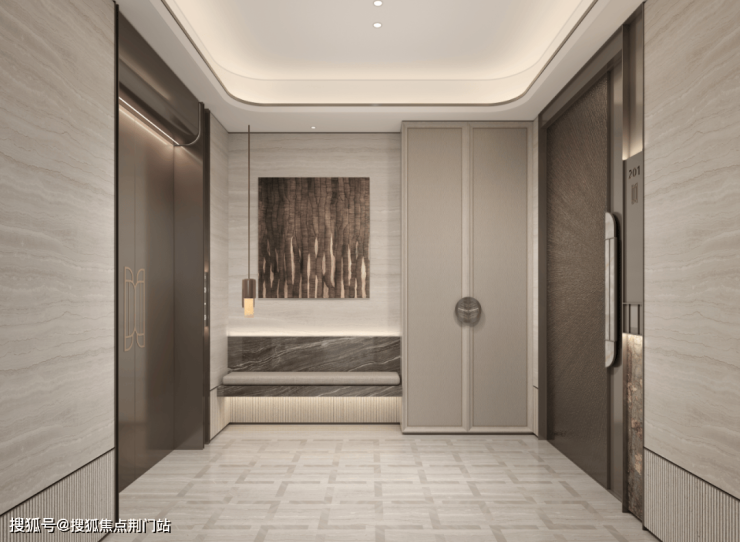 四向归家的大门设计,打破了常规楼盘至多两个入口的局限,让出入更加自由,生活动线也更符合日常需求。整体抬地5.4米的设计,不仅抬高了地势,同时将不利设施巧妙隐藏,更塑造了归家的仪式感。南向主入口以玉琮造型石柱、铝板挑檐和汉白玉雕塑营造出温润如玉的入口氛围,同时配备无障碍平接设计和多类电梯,确保每一次归家都顺畅便捷。