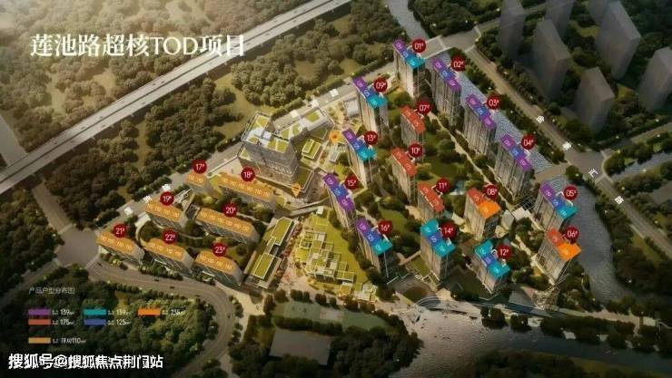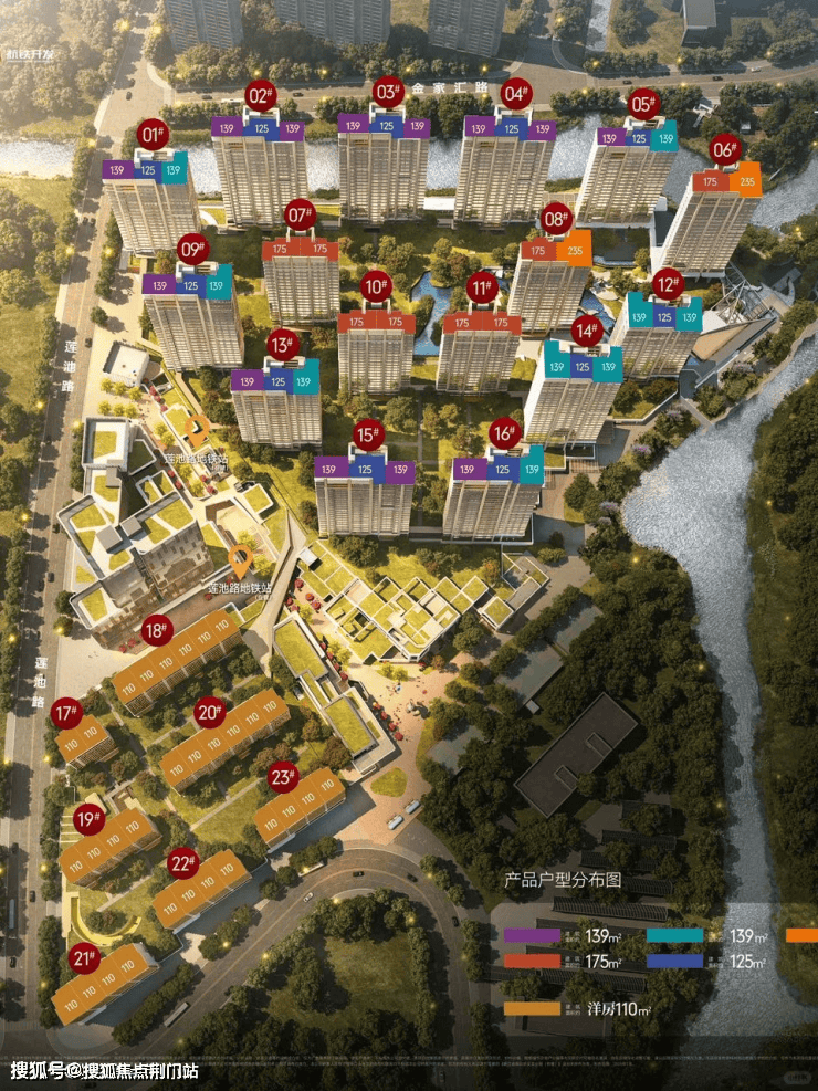 南区由7幢8-10层低密洋房组成,整体成行列式布局,仅110方一个独苗户型。商业部分由1幢23层商务楼+约600米滨水森林商业街区组成,地铁4号线莲池路站在南区和北区之间。