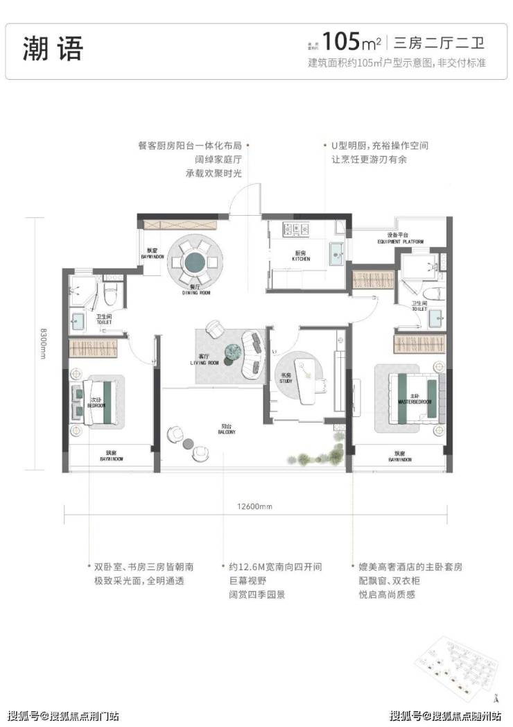 建筑面积约105㎡实现四开间朝南,约12.6米南向面宽,主次卧类双套房设计,颠覆市场对空间尺度的想象边界。