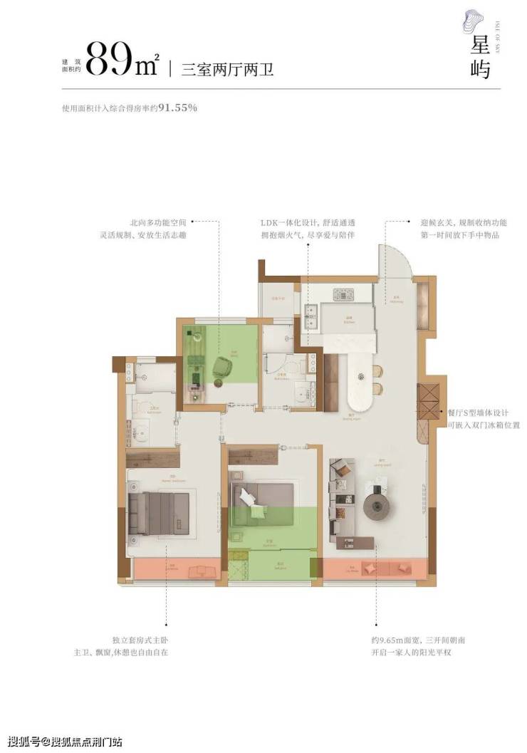 沐芳洲全盘建筑面积约89㎡-132㎡,通过阳台面积延伸、巧妙设置飘窗等手法,部分户型实际得房率可达约100%。