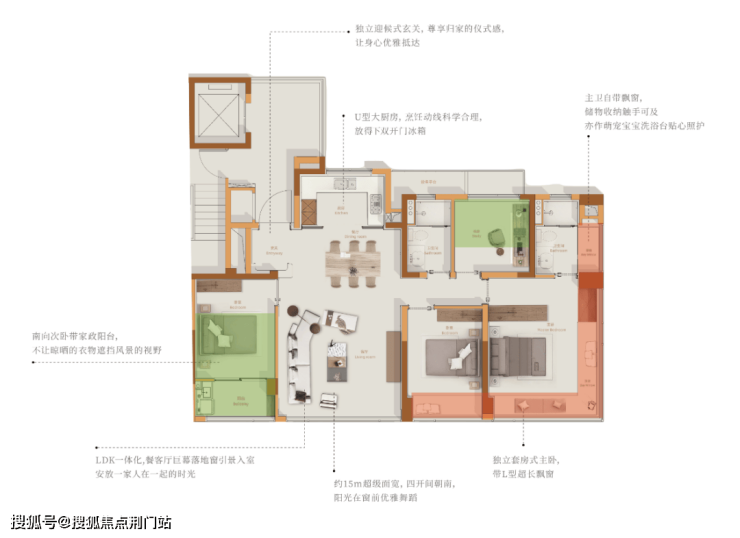 U型厨房与餐厅相连,轻松容下双开门冰箱;主卧独立套房,媲美豪宅的270°转角大飘窗设计,坐拥无敌视野。