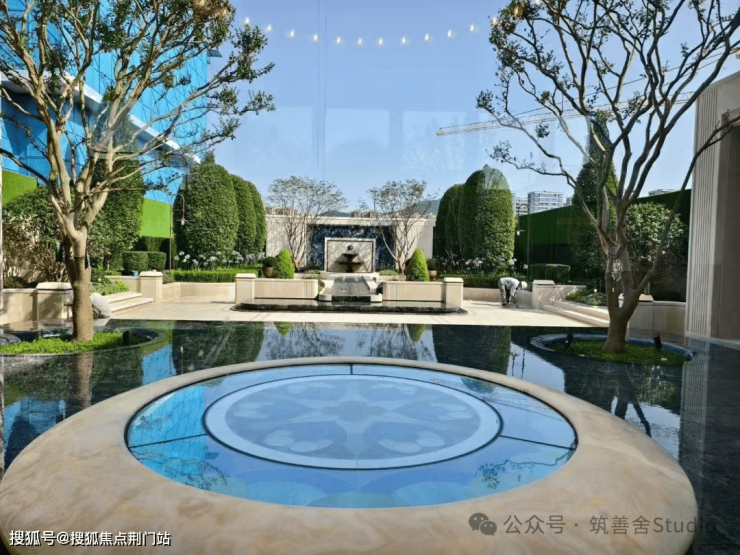 进入园区,迎面而来的是前庭两株苍劲的紫薇老树,仿佛伸开双臂欢迎每一位访客。园区中轴线上,两侧对称地盛开着杭州市的市花——丹桂,它们在法式园林的轴线布局中,巧妙地融入了东方的审美意趣。此外,水景的底座选用奢华石材精心镶嵌,为整体景观增添了一抹独特的艺术气息。