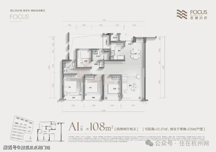作为设计成公建化外立面的君潮润府,其高层住宅中,有不少中间套108㎡房源设计成了四房。