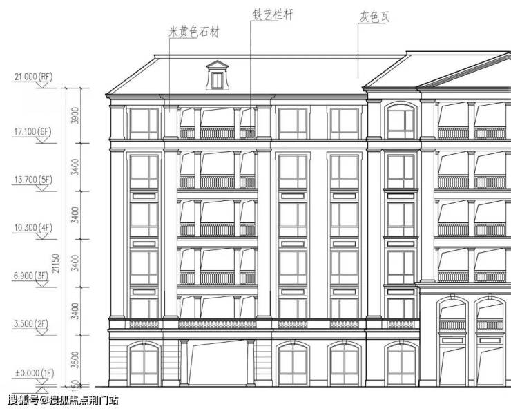 建筑主体采用米黄色干挂石材搭配坡屋顶灰色套娃,整体非常有质感。