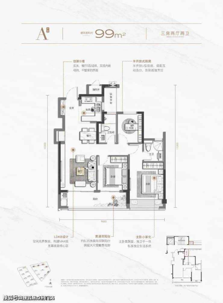 相比于168与129,99可谓将性价比拉满, 三房两卫、LDKB设计满足居住的舒适性需求, 三开间面宽+双开间阳台,将家的“观景面”放大,并且通过 创新S墙设计,实现“内嵌式”收纳,在提升收纳能力的同时,更实现墙面的平整美观。