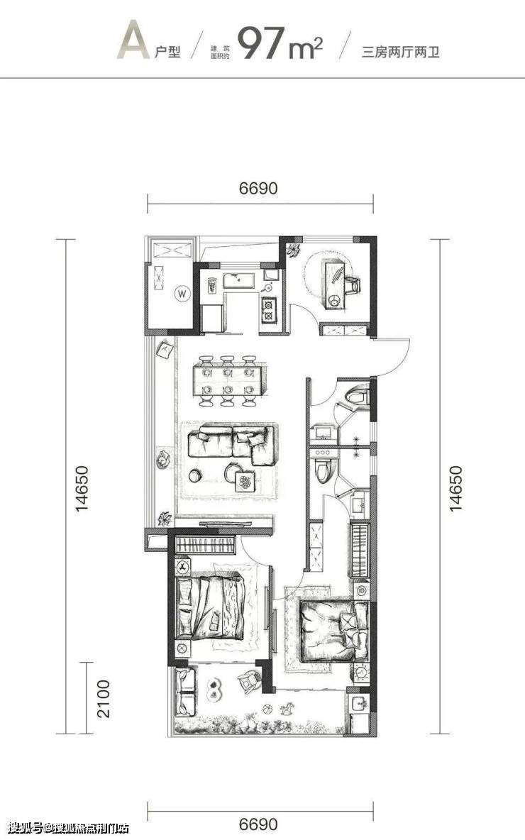 同样“只此一家,别无分号”的户型,是建面约97㎡边套。如今你能买到的边套户型,面积往往都在117㎡以上,而潮正府的97㎡竟然就做了全明边套!