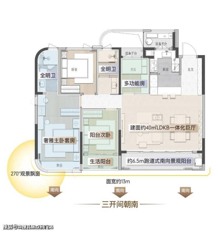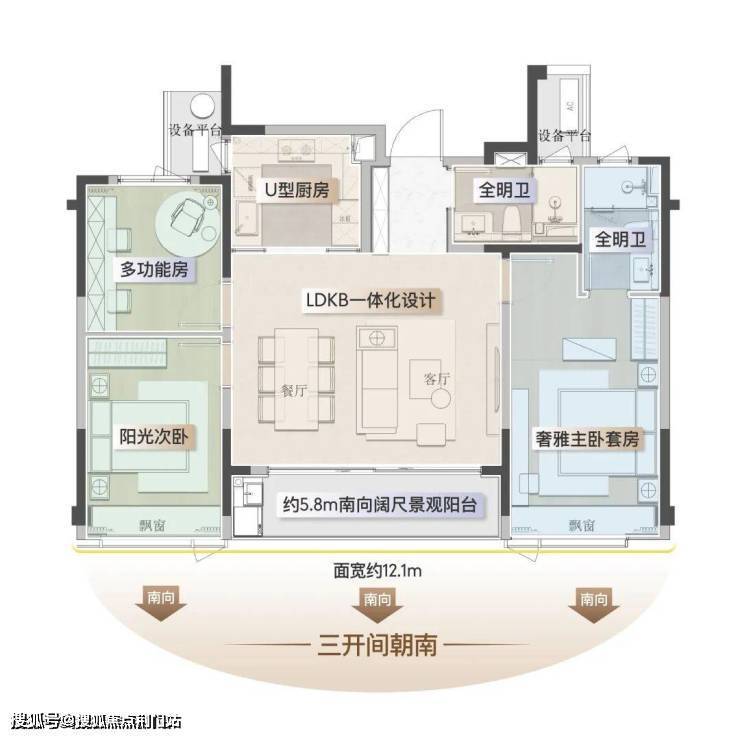 其中,建面约115㎡经典户型,爆款上新:该户型以“三开间朝南+大尺度横厅”重构空间格局。约27㎡餐客厅与约5.8米观景阳台无缝串联,形成“社交—景观—生活”三重动线,配合约12.1米南向面宽实现“阳光平权”;约3米层高搭配弧形吊顶与全屋智能家居系统,玄关柜及部分收纳柜交付即享,北次卧可灵活改造为书房或亲子区,满足年轻家庭成长需求。