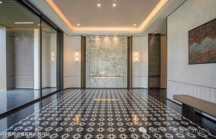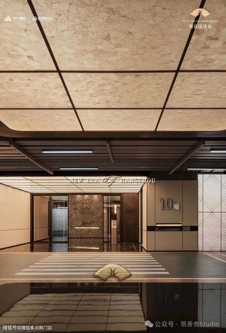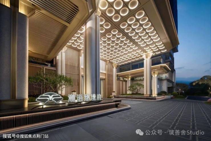 在宽阔的挑檐与全景落地窗的映衬之下,30米超宽门庭显得气吞山河,犹如画卷中描绘的潮语臻境府华美起笔。四根精美雕刻的奢石罗马柱,典雅挺拔,支撑起高达9米的门楼,金碧辉煌的穹顶在两侧镜面水景的映射之下,光彩流转,而细水潺潺,隔绝了外界喧嚣,步入门内,即刻仿佛步入迪拜帆船酒店的奢华境界。