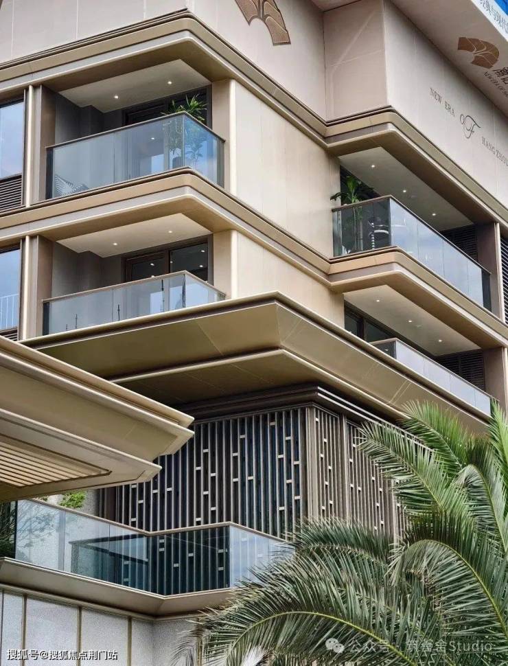 建筑立面在板块内率先采用大面铝板与玻璃相结合的设计,辅以涂料和石材,打造出独具匠心的外观。屋顶采用流畅的金色云冠造型,米色与香槟金铝板巧妙运用精细的斜切工艺及圆滑弧角,使得窗框更显立体,营造出蕴含东方韵味的「金色画框」,其美艳无声,引人入胜。