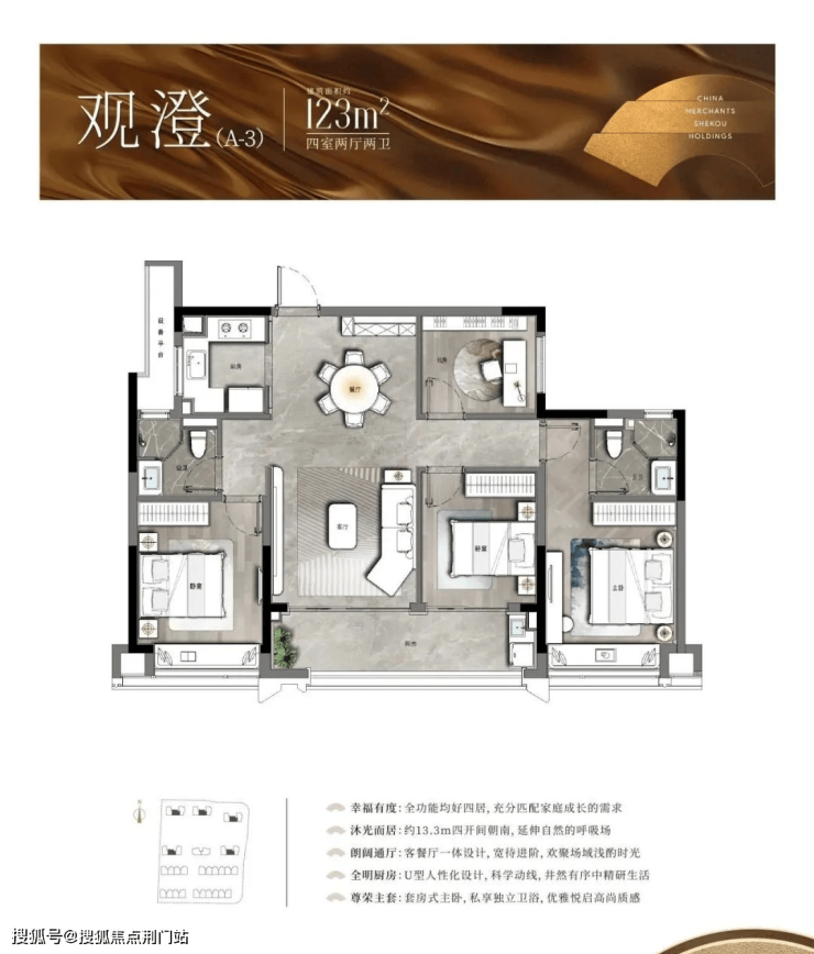 约123㎡户型,布局规整大气,四开间搭配双联阳台,全部朝南设计,南向面宽达约13.3米,将园区美景最大化引入室内,每一角落皆可饱览四季变换的自然画卷,与外界环境无缝融合。此外,精心规划三间南向卧室,无论是主卧、儿童房还是老人房,均享有充足阳光,让每位家庭成员都能沐浴在阳光之中。