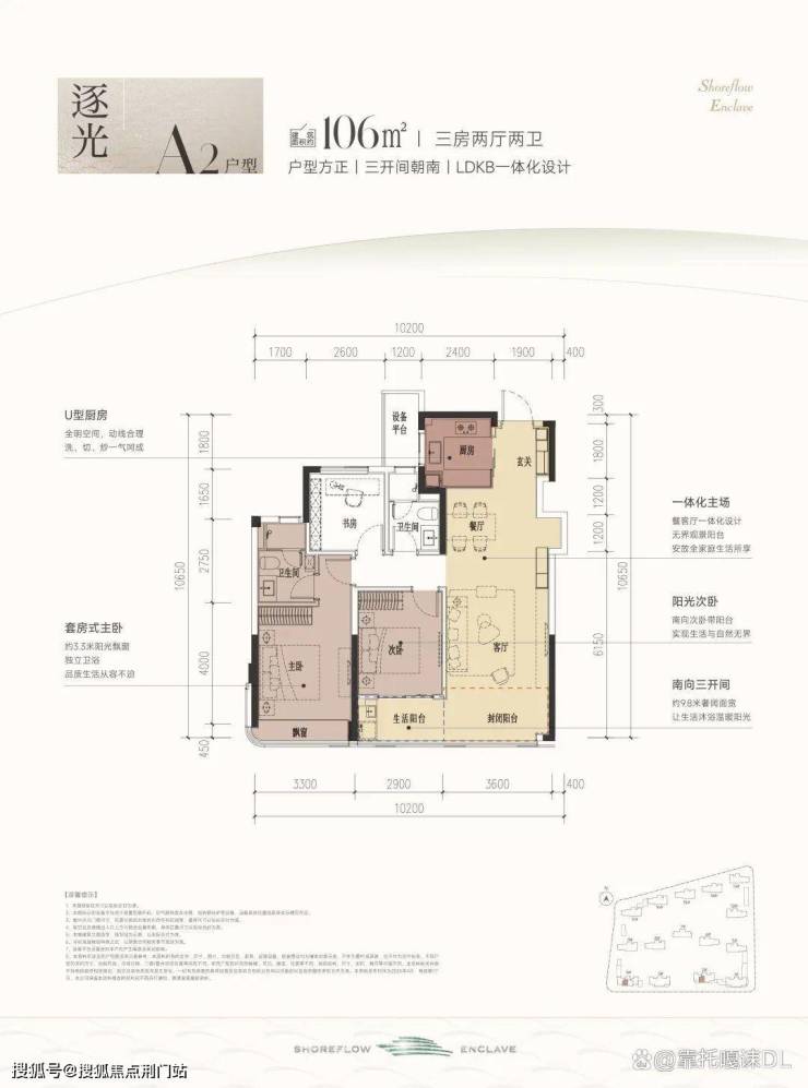 建面约106㎡A1三室两厅两卫户型: