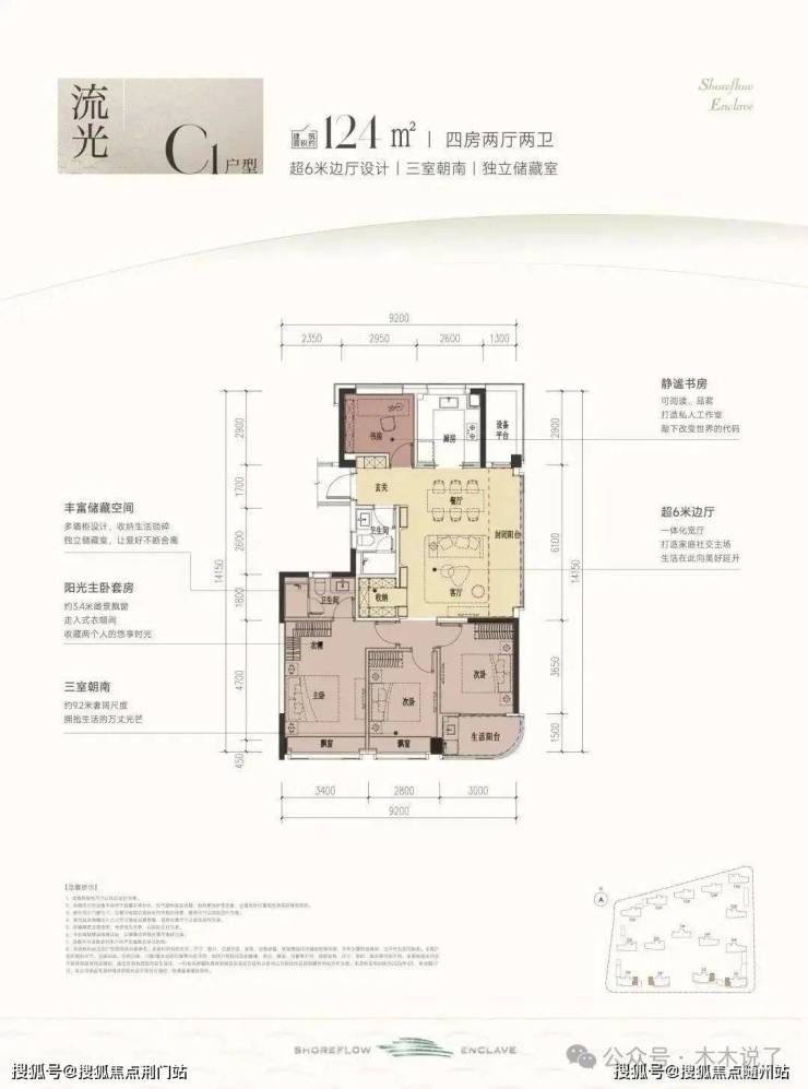 #滨江时舟里,这款户型堪称四开间朝南的“流量王者”,南向面宽约13米,双联阳台+双飘窗设计,视野和采光优秀;套房主卧、双阳光次卧,颇有大平层的气势。