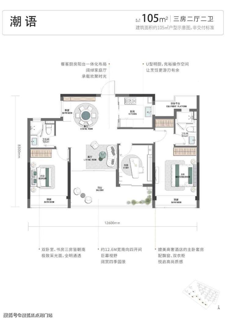 建筑面积约105㎡实现四开间朝南,约12.6米南向面宽,主次卧类双套房设计,颠覆市场对空间尺度的想象边界。