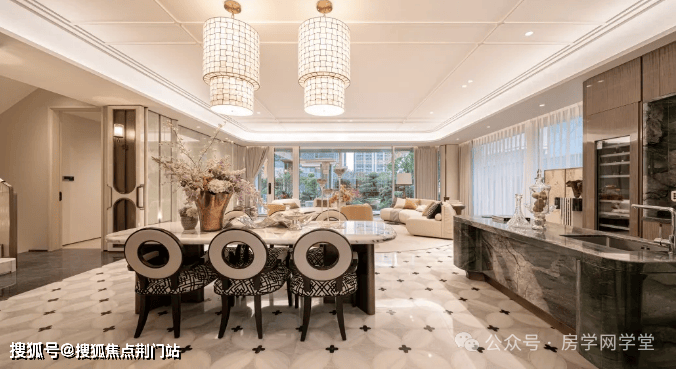 阔尺电梯厅→尊崇玄关→客餐厅,一方面让入户体验有了内外兼修的气度,另一方面以层层递进的序列关系凸显了华宅中的仪式感,就连起步建面约183方户型也有如此高规格的配置。