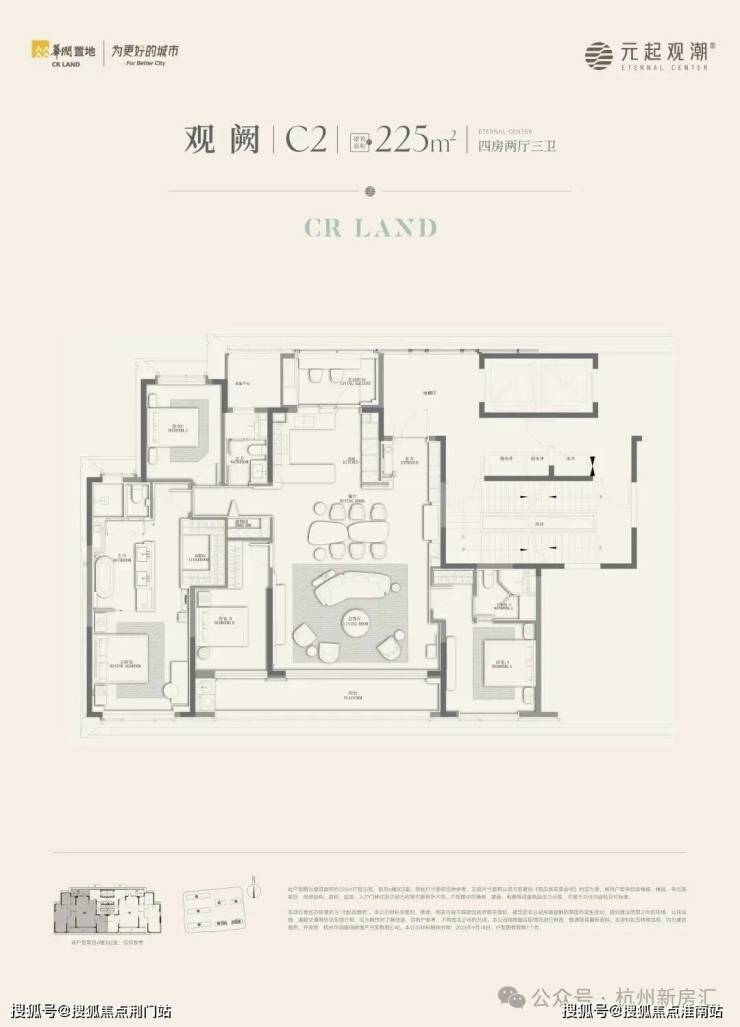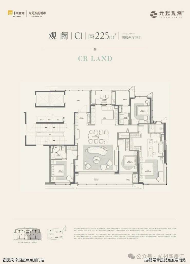 起步约225㎡户型都大宅感十足:同样是两梯两户,这个户型还配备了“全明电梯厅”。四房三卫的格局,南向排布三个卧室。其中,主卧不仅自带270°转角窗,还设计了“洄游式”动线:开放式的梳妆区串联休息区和衣帽间,完成场景的无缝转换。